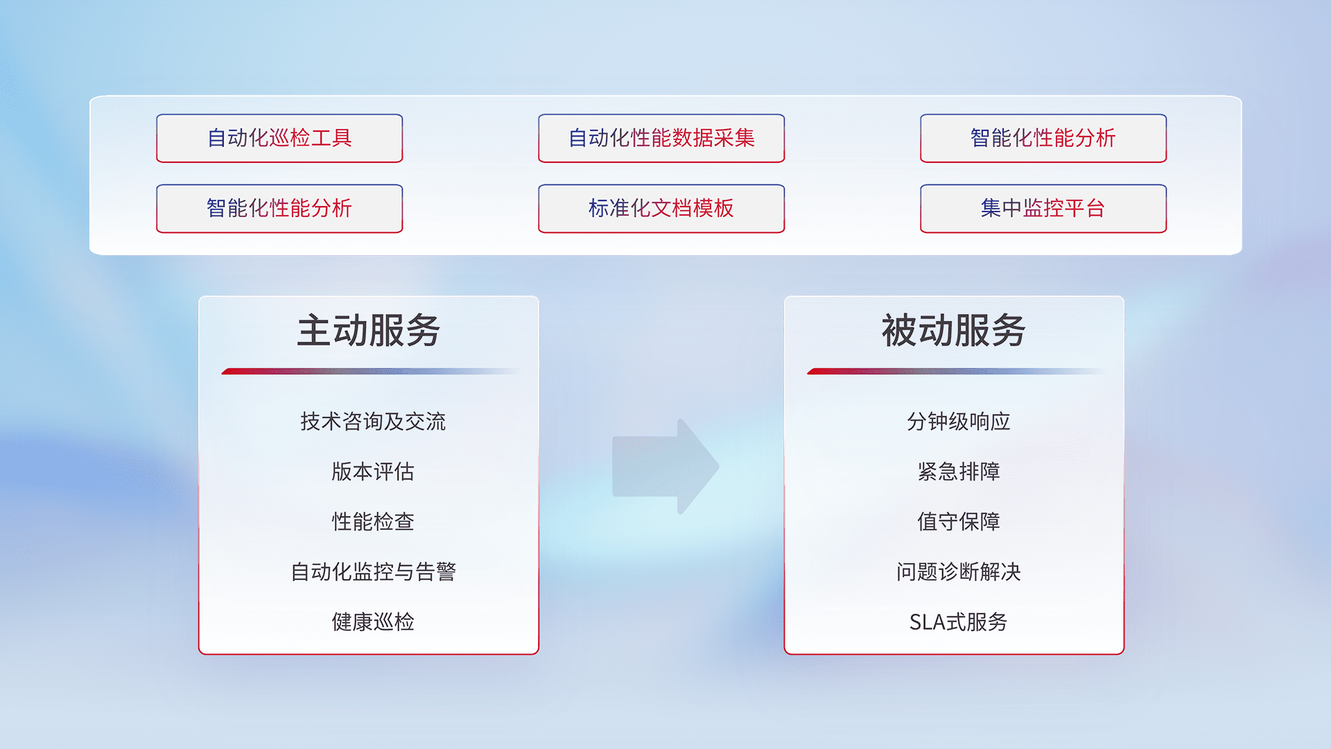 智能化工具和标准化文档,,,,保障服务质量,,提供主动服务(包含技术咨询、、、、版本评估、、、、性能检查、、自动化监控与告警、、健康巡检)和被动服务包含(分钟级响应、、紧急排障、、值守保障、、问题诊断解决、、SLA服务)。。。。